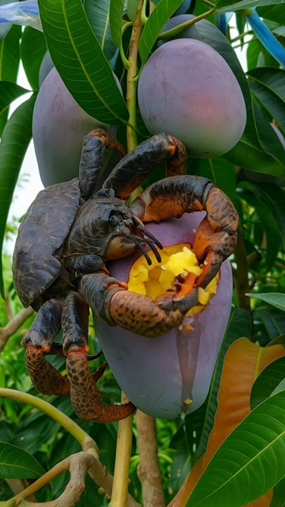 The smart coconut crab is eating mango fruit in the evening #coconutcrab #crabvideo